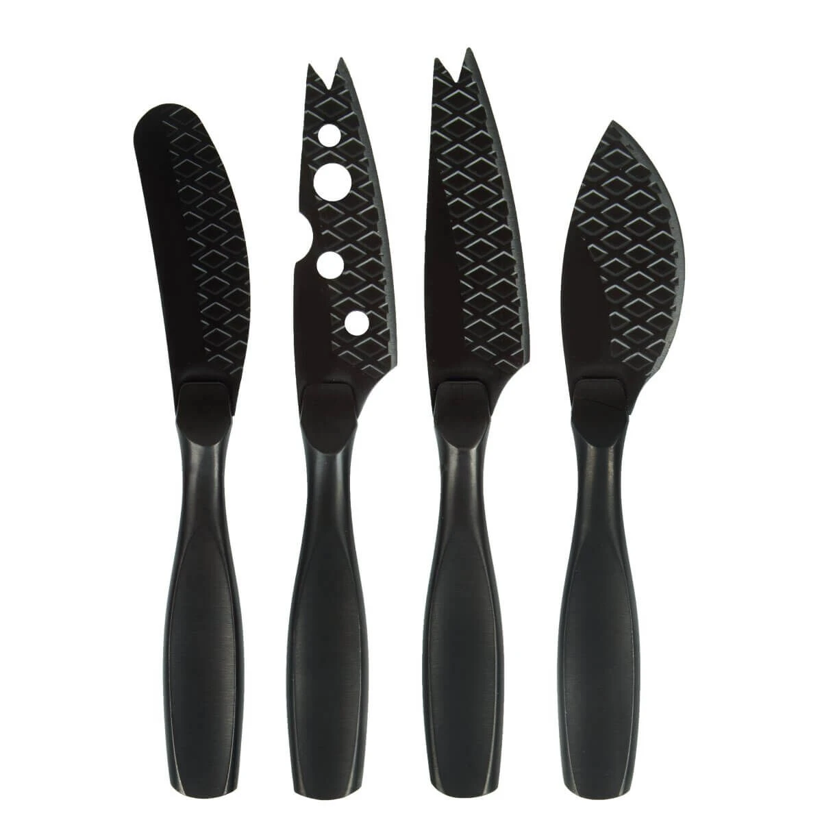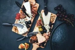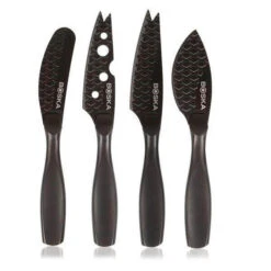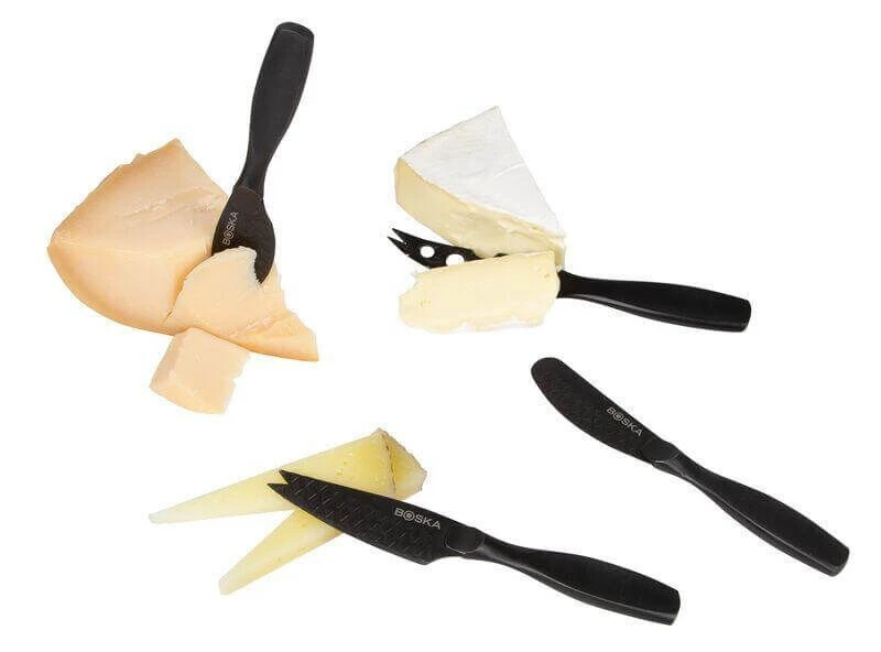 De Kaasmessenset Mini Monaco+ Zwart bevat vier compacte, unieke en stijlvolle messen. Het zijn scherpe messen die geschikt zijn voor elk type kaas. En speciaal aan deze messen is dat door de zwarte coating en het wafelpatroon deze messen non-stick zijn. Gebruik het smeermes voor verse kaas en het mes met de gaten in het lemmet voor zachte tot half harde kaas. Prik stukken half harde kaas aan de punten aan het mes met de gevorkte punt en het Parmesan mes is om harde kaas te breken.
