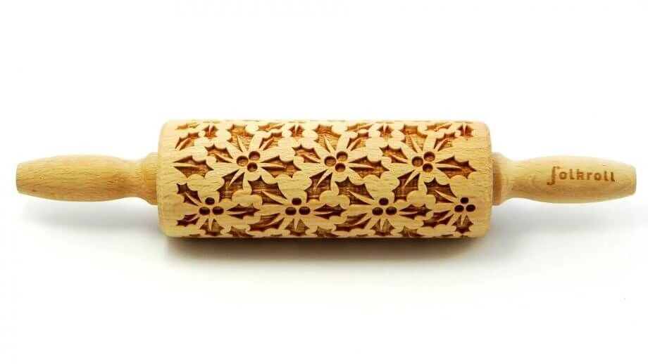 De Folkroll Junior-deegroller met het patroon Holly is vervaardigd uit beukenhout. Het bedrukte deel van de deegroller is 11,5 cm lang, en heeft een diameter van 4,5 cm. De gehele deegroller heeft een lengte van 23 cm. Gebruik de Folkroll-deegroller voor het decoreren van koekjesdeeg, chocolade, suiker, marsepein, zout, keramiek of kleiproducten.
