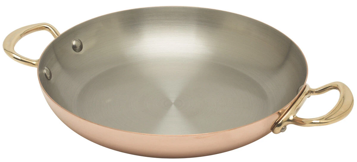De ronde Mauviel M’150B serveer- en paellapan heeft een diameter van 16 cm en is voorzien van twee glanzend gepolijste bronzen handgrepen. De pan is gemaakt van 1,5 mm dik koper en aan de binnenzijde afgewerkt met een slijtvaste laag roestvrij staal. Gebruik de serveerpan voor het bereiden en serveren van gerechten als risotto en paella of tartes tatin.
