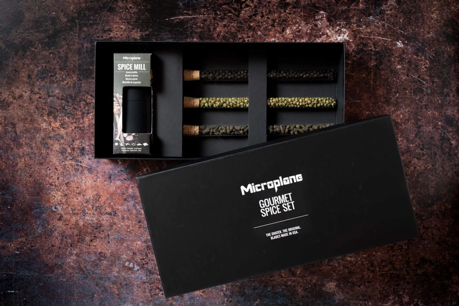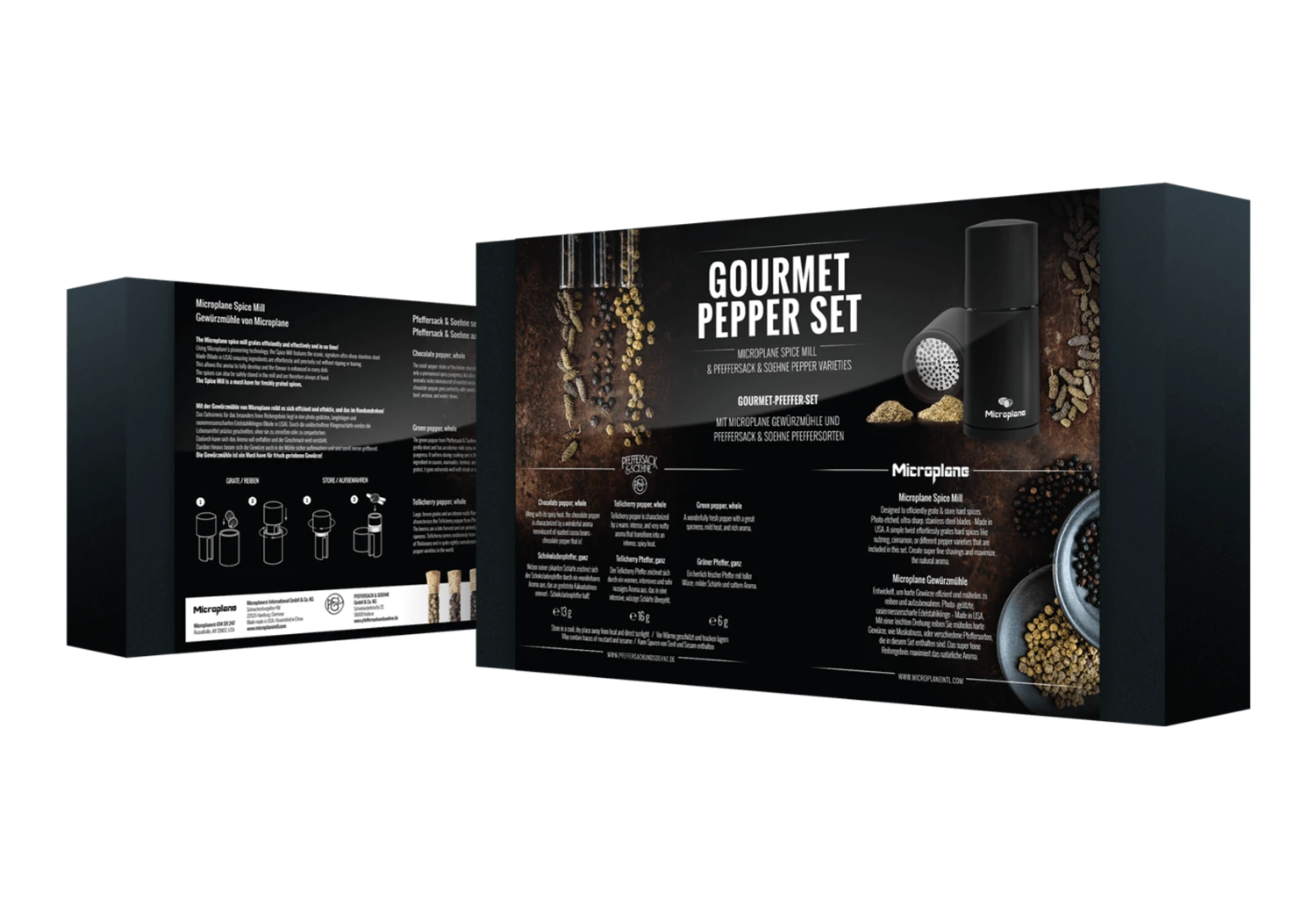 De Microplane kruidenmolen is vervaardigd van kunststof en roestvrij staal. U gebruikt de rasp voor het raspen van verschillende soorten harde specerijen. De Microplane raspschijf is door een laser uitgesneden en behoudt hierdoor lang zijn scherpte. Deze cadeauset bestaat uit de kruidenmolen en drie soorten pepers.