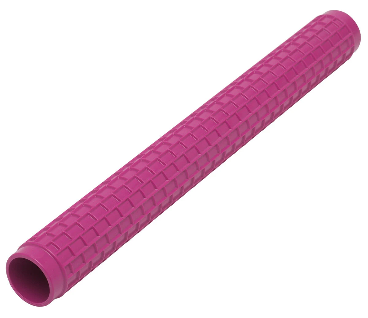 Deze Silikomart Wonder Cakes reliëfroller is gemaakt van roze kunststof en heeft een reliëf met bakstenen. De deegstok heeft een lengte van 40 cm en creëert een patroon in deeg, marsepein of rolfondant.