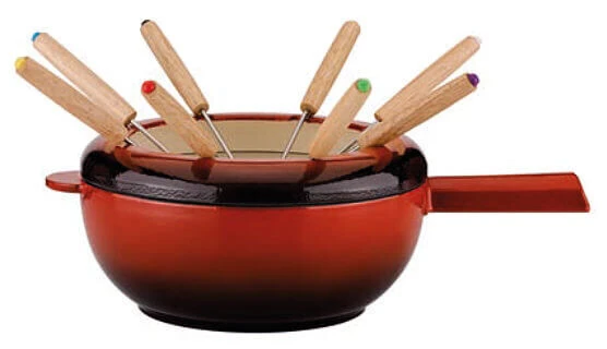 De Spring Saas Fee kaasfonduepan heeft een diameter van 20 cm en heeft een inhoud van 2 liter. De pan is gemaakt van roodkleurig geëmailleerd gietijzer en heeft een anti-spatdeksel met acht inkepingen waarin de acht fonduevorken kunnen rusten. De vorken – met houten handgreep – hebben allemaal een eigen kleur om ze gemakkelijk te kunnen herkennen.