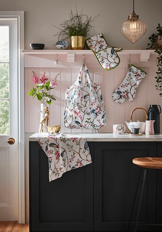 Het Ulster Weavers Oriental Birds schort is gemaakt van katoen. Gebruik het schort om uw kleding tegen spetters en vlekken te beschermen. Het Oriental Birds schort is voorzien van een afbeeldingen van een kraanvogels en bloesem met een witte ondergrond. Het schort is 95 cm lang en 70 cm breed.