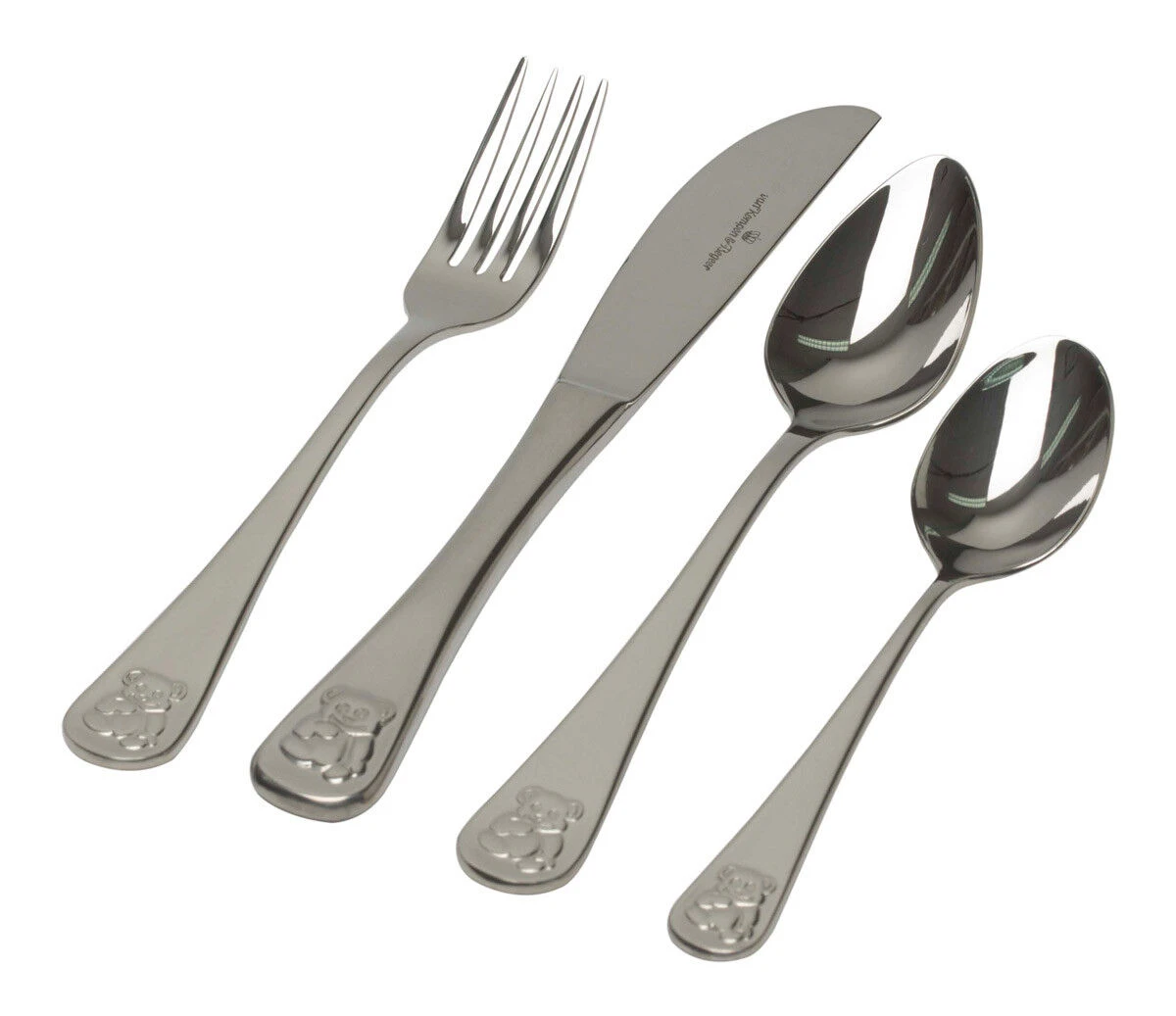 Het Van Kempen & Begeer Junior Beer kinderbestek is vervaardigd uit roestvrij staal. Het bestek is voorzien van afbeeldingen van een beer in de onderzijde van het heft.