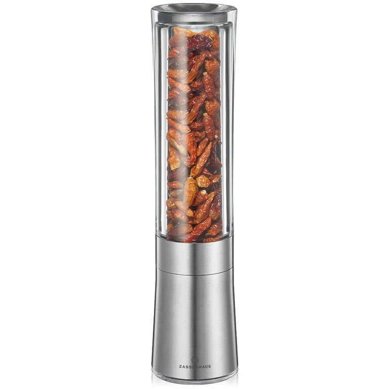 De Zassenhaus Diavolo chilimolen is gemaakt van roestvrij staal en acryl. De molen is 21 cm hoog en heeft een diameter van 5,5 cm. Gebruik om gemakkelijk en snel gedroogde pepers te vermalen.